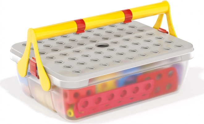 Alle onderdelen berg je op in een stevige box met handvat. Het geperforeerde deksel dient als bouwplaat – ideaal voor thuis en onderweg.