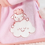 De onesie heeft een originele print van een schaapje op een wolkje dat geniet van een regenboogdouche.