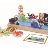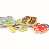 • Houten zeefiguren: vuurtoren, krab, kanon, octopus, walvis, papegaai, eiland met palmen, schatkist, kaart en piratenschip.