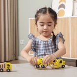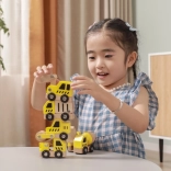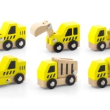 Elk voertuig heeft functionele wielen voor soepel rollen en sommige onderdelen suggereren beweegbare functies (bijv. bak, mixer of kraan), wat de natuurlijke nieuwsgierigheid en de ontwikkeling van de oog-handcoördinatie stimuleert.