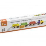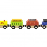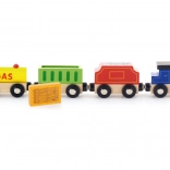 Kleurrijk houten treintje met locomotief en 3 wagons met het thema energiebronnen, perfect voor kleine machinisten. De wagons koppelen eenvoudig dankzij magnetische koppelingen, zijn compatibel met de meeste houten treinbanen en stimuleren fantasie en fijne motoriek. Afmeting per wagon ca. 7 × 4,5 × 2,5 cm, geschikt vanaf 3 jaar.