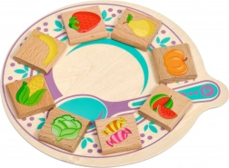 Dit doordachte Montessori-materiaal leert kinderen onderscheiden wat geschikt is om te eten en wat niet. Op de houten onderleggers staan een bord met lepel en een rieten mandje afgebeeld, waar de kinderen tegeltjes met afbeeldingen van fruit, groente, snoep of drankjes, maar ook sleutels, lampen, naalden of potloden bijleggen. Het spel ondersteunt op een natuurlijke manier wereldverkenning, concentratie en communicatieve vaardigheden.