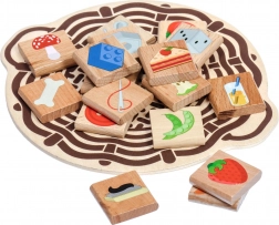 • 56 houten tegeltjes met kleurrijke illustraties van eetbare en niet-eetbare objecten