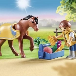 De set bevat een kinderfiguur, pony met deken en hoofdstel, rijhoed, emmer, tas, borstel en andere accessoires. De onderdelen zijn gemakkelijk afwasbaar, duurzaam en veilig voor kinderen.
