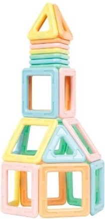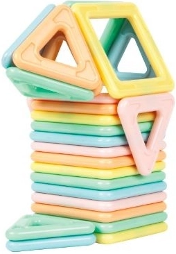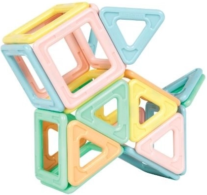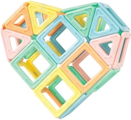 De set bevat 18 vierkanten en 12 driehoeken in pastelkleuren, waarmee uiteenlopende modellen gebouwd kunnen worden.