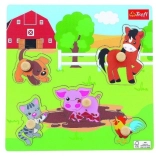 Deze houten mini-puzzel met boerderijmotief is ideaal voor kinderen vanaf 18 maanden. Dankzij de houten knopjes zijn de stukjes comfortabel vast te houden en eenvoudig te plaatsen. De onderplaat heeft uitgefreesde vormen met zwart-witte contouren, wat het kind helpt de vormen correct te matchen.