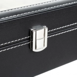 Een elegante organizer voor horloges en sieraden met 12 vakken die je collectie veilig opbergt en prachtig presenteert. Hij heeft een transparant deksel, een zwarte afwerking met contrasterend stiksel en zachte bekleding. Magnetische sluiting houdt de inhoud veilig, uitneembare kussentjes beschermen tegen krassen en maken het mogelijk om ook armbanden, kettingen en ringen op te bergen. Een geweldig cadeau voor zowel vrouwen als mannen en een stijlvolle toevoeging aan ieder interieur.