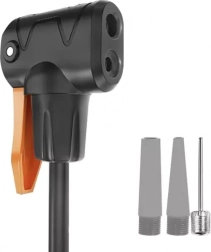 Universele tweepoorts pomp kop met hendel voor snelle vergrendeling past op auto- en fietsventielen. In de set: naald voor ballen en 2 conische opzetstukken voor matrassen en andere opblaasartikelen.