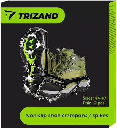 Betrouwbare antislip-ijspinnen TRIZAND in maat XL (44–47) zorgen voor een zekere tred op sneeuw en ijs. Dankzij stalen spikes en stevige kettingen bieden ze uitstekende tractie, stabiliteit en veiligheid tijdens winterse tochten en in de stad. De elastische TPE-overschoen is snel aan te trekken, zit stevig op de schoen en beschadigt het schoeisel niet. Inclusief een praktisch etui met rits voor eenvoudig meenemen.