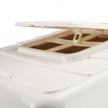 Tylna ścianka może być bezpiecznie uchylona i zablokowana, przekształcając domek w otwartą altanę. Wewnątrz jest więcej światła i powietrza, a pupil ma większy komfort; jednocześnie ułatwia to dostęp do środka podczas czyszczenia.