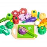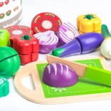 Zestaw jest świetnym dodatkiem dla dzieci, które mają zabawkowe kuchnie, stoiska i sklepy. Z tymi drewnianymi produktami zabawa będzie jeszcze bardziej kreatywna i na pewno przyniesie wiele radości. Wszystkie elementy są wykonane z drewna i pokryte farbą bezpieczną dla dzieci. Warzywa składają się z dwóch połówek połączonych rzepem, co umożliwia dzieciom zobaczenie, jak wyglądają w przekroju. W zestawie jest także drewniana deska i nóż.