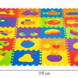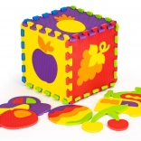 Elementy z zamkami puzzle umożliwiają dowolne ułożenie – rozłóż ją jako strefę zabawy lub z elementów zbuduj kostki i wieże. Wkładki z motywami owoców i przedmiotów można wyjmować, dzięki czemu dzieci trenują rozpoznawanie kształtów i kolorów, małą motorykę i logiczne myślenie. Antypoślizgowa powierzchnia zapewnia stabilność, a materiał EVA jest bezpieczny i łatwy do mycia.