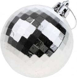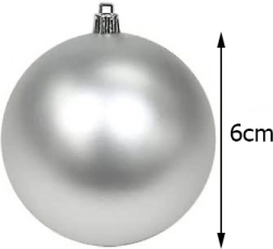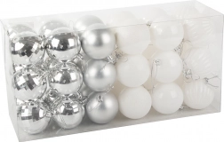 Elegancki zestaw 36 bombek świątecznych o średnicy 6 cm w kolorach białym i srebrnym do harmonijnego ozdobienia choinki i wnętrza. Nietłukące, plastikowe wykonanie jest bezpieczne dla dzieci i zwierząt, bombki są lekkie i w sześciu wykończeniach powierzchni (mat, połysk, brokat, wzór, gładka, disco) pięknie odbijają światło.