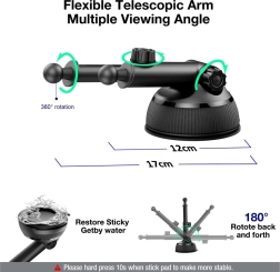 Przymocuj do szyby lub deski rozdzielczej za pomocą mocnej przyssawki, ewentualnie do kratki nawiewu klipsem. Przeguby kulowe umożliwiają obrót o 360° dla idealnego kąta.