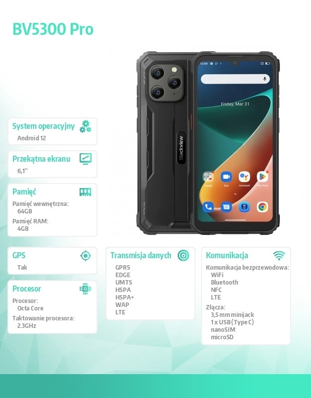 Blackview BV5300 Pro wyróżnia się 6,1-calowym ekranem IPS, który oferuje jasny i ostry obraz dzięki rozdzielczości 1560 x 720 pikseli. Wydajny ośmiordzeniowy procesor MediaTek Helio P35 osiąga taktowanie do 2,3 GHz, co zapewnia szybkie i płynne działanie systemu, wspierane przez 4 GB RAM i 64 GB pamięci wewnętrznej. Pamięć można rozszerzyć za pomocą karty microSD do 512 GB, co zapewnia dużo miejsca na wszystkie potrzeby.