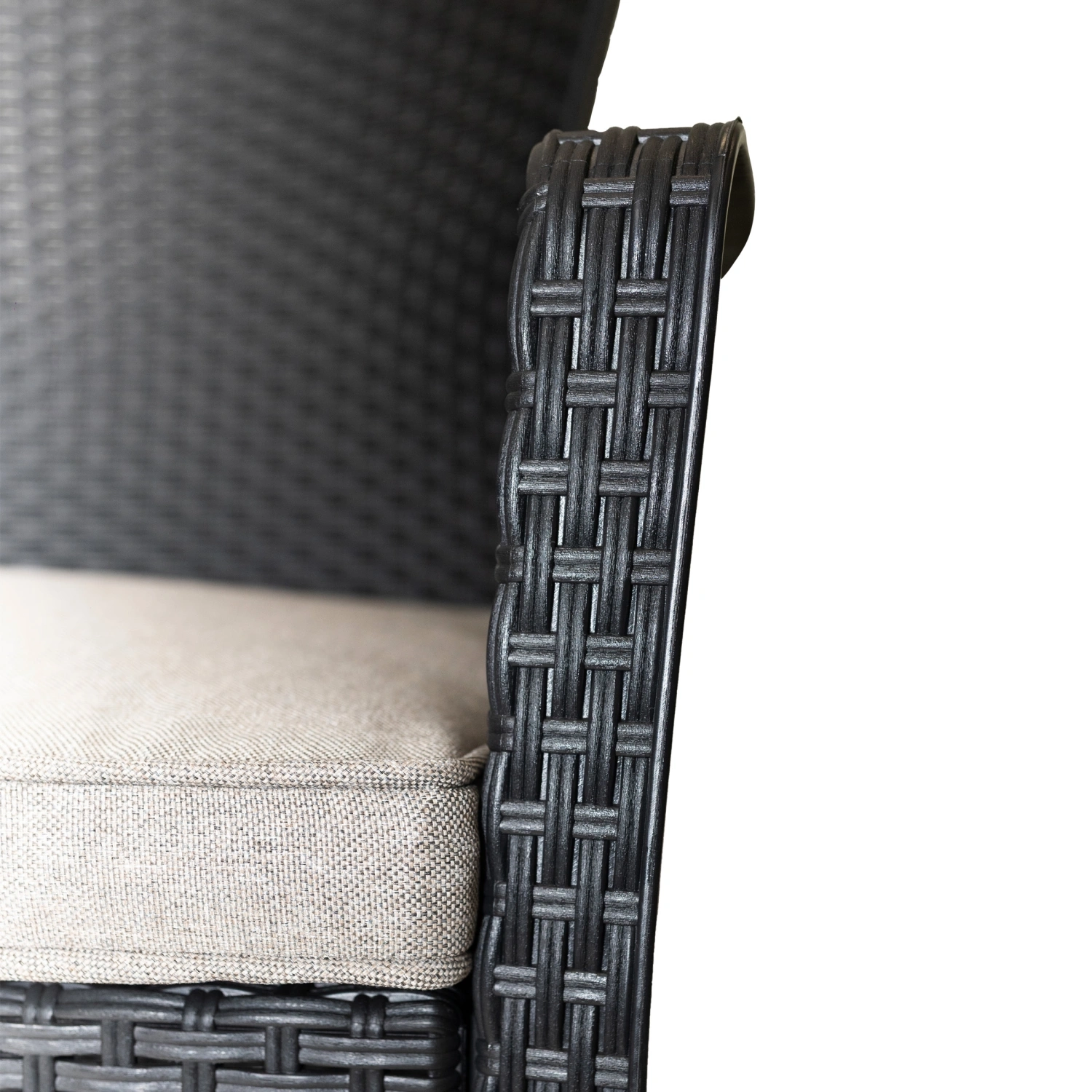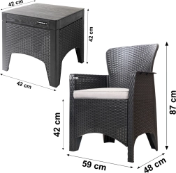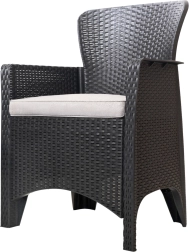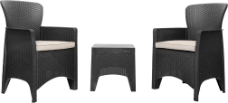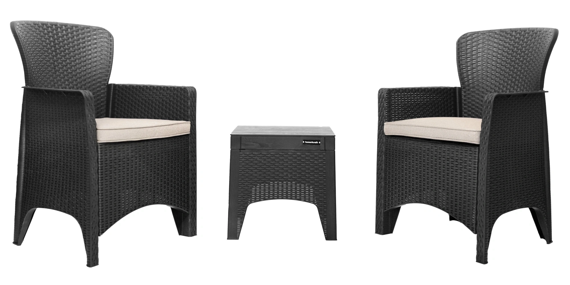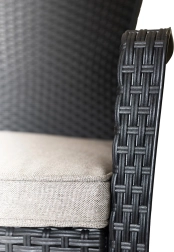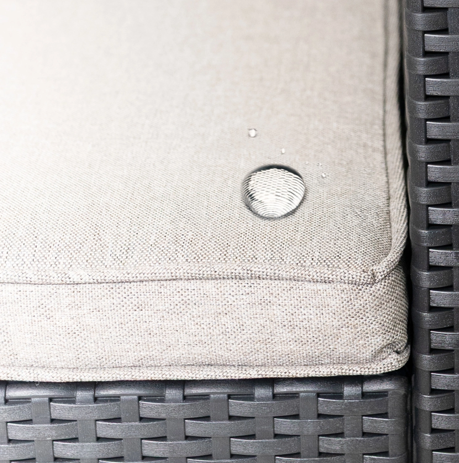 Przemyślany design oferuje wodoodporne poduszki, które chronią przed wilgocią i łatwo się czyszczą. Konstrukcja wykonana jest z wytrzymałego polipropylenu z wykończeniem w stylu technorattanu, które nadaje elegancki, nowoczesny wygląd oraz odporność na promieniowanie UV i deszcz. Gładka powierzchnia łatwo się czyści i zachowuje wygląd sezon po sezonie.