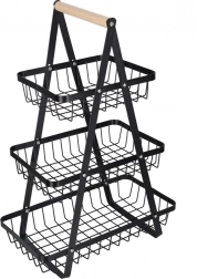 Uporządkuj kuchnię, spiżarnię lub jadalnię dzięki eleganckiemu trzypoziomowemu stojakowi. Solidna metalowa konstrukcja w matowej czerni oraz wygodny drewniany uchwyt zapewniają stabilność, trwałość i łatwe przenoszenie. Dzięki stopniowanemu układowi zawartość jest zawsze na widoku i pod ręką.