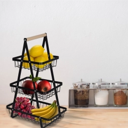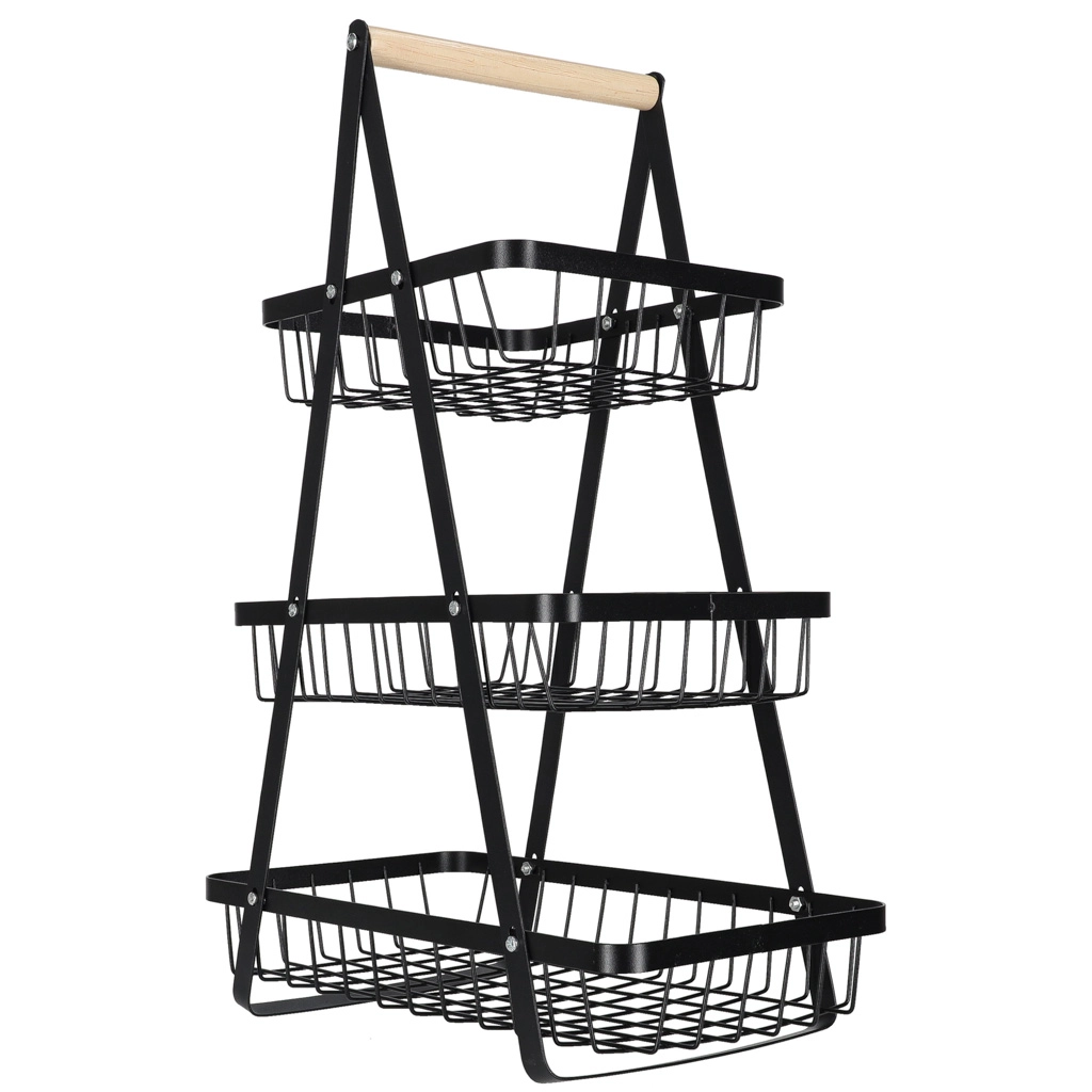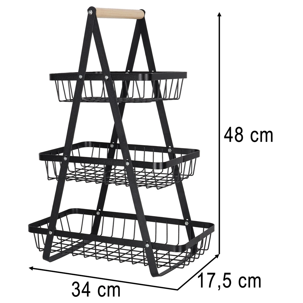 Stylowy trzypoziomowy kosz na owoce z wytrzymałego metalu z drewnianym uchwytem oszczędza miejsce na blacie i utrzymuje porządek w kuchni. Trzy pojemne koszyki z otwartą, drucianą konstrukcją zapewniają cyrkulację powietrza dla dłuższej świeżości owoców i warzyw. Idealny także na pieczywo, przekąski czy akcesoria łazienkowe.