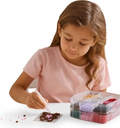 Zawartość opakowania: aż 9000 koralików w wielu kolorach, 6 podstawek (koło, kwadrat, gwiazda, serce itp.), 2 pęsety, papiery do zaprasowywania, szablony projektowe oraz pojemny organizer z przegródkami. Dzięki piętrowemu boxowi wszystko jest przejrzyście uporządkowane i gotowe na dalsze tworzenie w domu i w podróży.