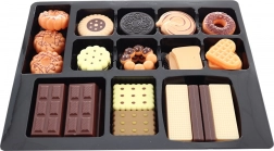 Zestaw obejmuje wybór słodkości – wafle, ciasteczka, czekoladę i gofry – idealny do zabawy w sklep lub kuchnię. Praktyczne opakowanie w pudełku prezentowym tworzy z niego świetny prezent dla małych kucharzy.