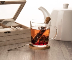 To eleganckie szklane sitko w kształcie fiolki umożliwia wygodne parzenie bezpośrednio w kubku, filiżance lub szklance. Drobne perforacje przepuszczają pełnię smaku i aromatu naparu, jednocześnie zatrzymując listki w środku. Korek z korka jest wystarczająco długi, aby bezpiecznie wyjąć sitko bez ryzyka poparzenia.