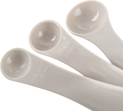 Miarki są wykonane z trwałego, bezpiecznego dla żywności plastiku, można je myć w zmywarce, a praktyczne kółko łączące gwarantuje, że poszczególne elementy się nie zgubią. Kółko można łatwo rozłączyć i używać miarek także oddzielnie.