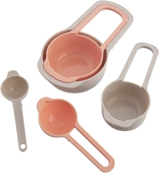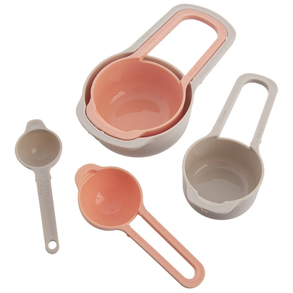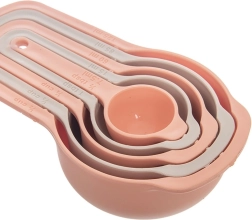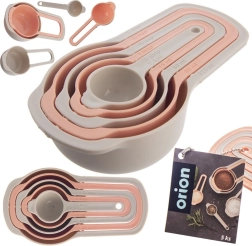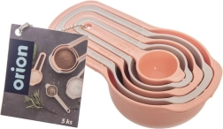 Praktyczny zestaw pięciu kuchennych miarek do precyzyjnego odmierzania składników podczas gotowania i pieczenia. Każda miarka ma wyraźne oznaczenia w ml, szklankach i łyżkach. Trwałe wykonanie z plastiku w kolorze beżowym i łososiowym, odpowiednie do zmywarki, możliwość sztaplowania dla oszczędności miejsca oraz idealne do suchych i płynnych składników.
