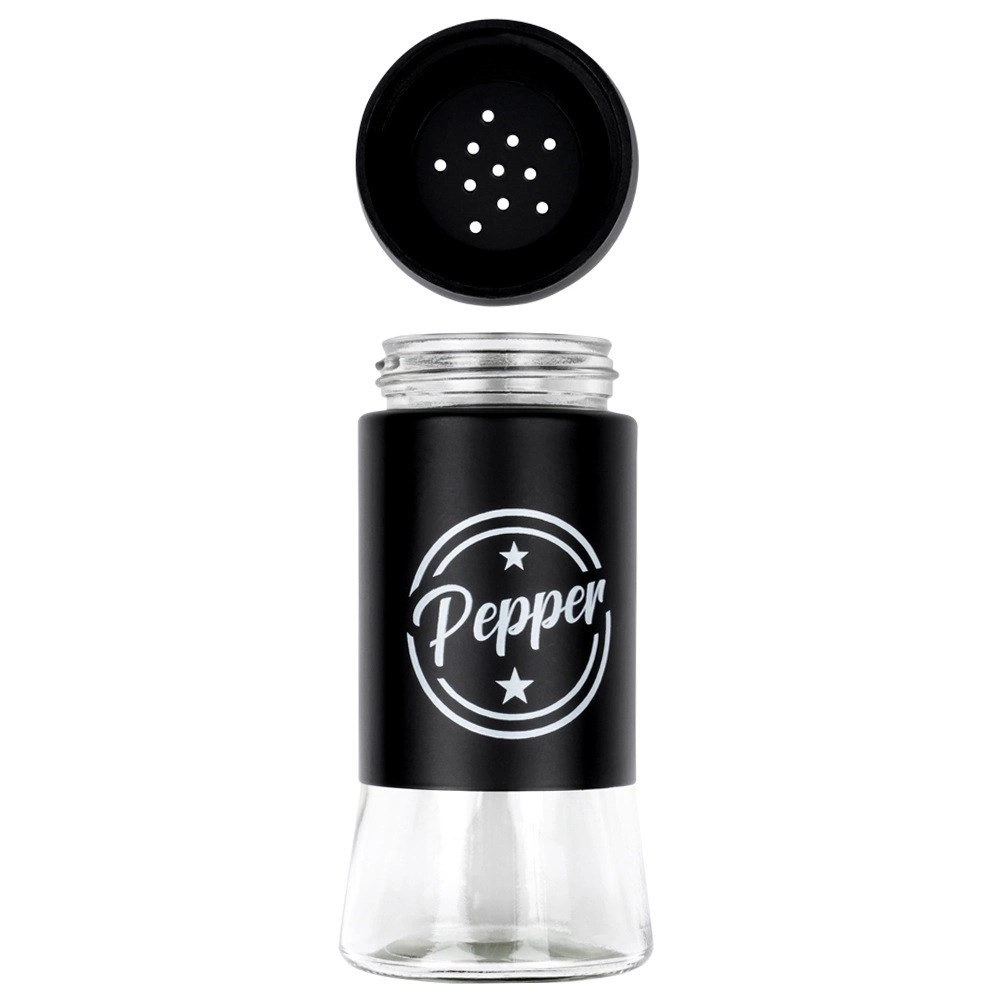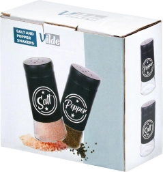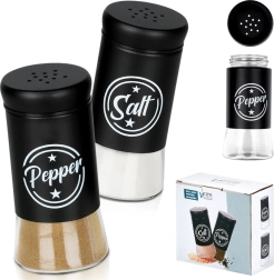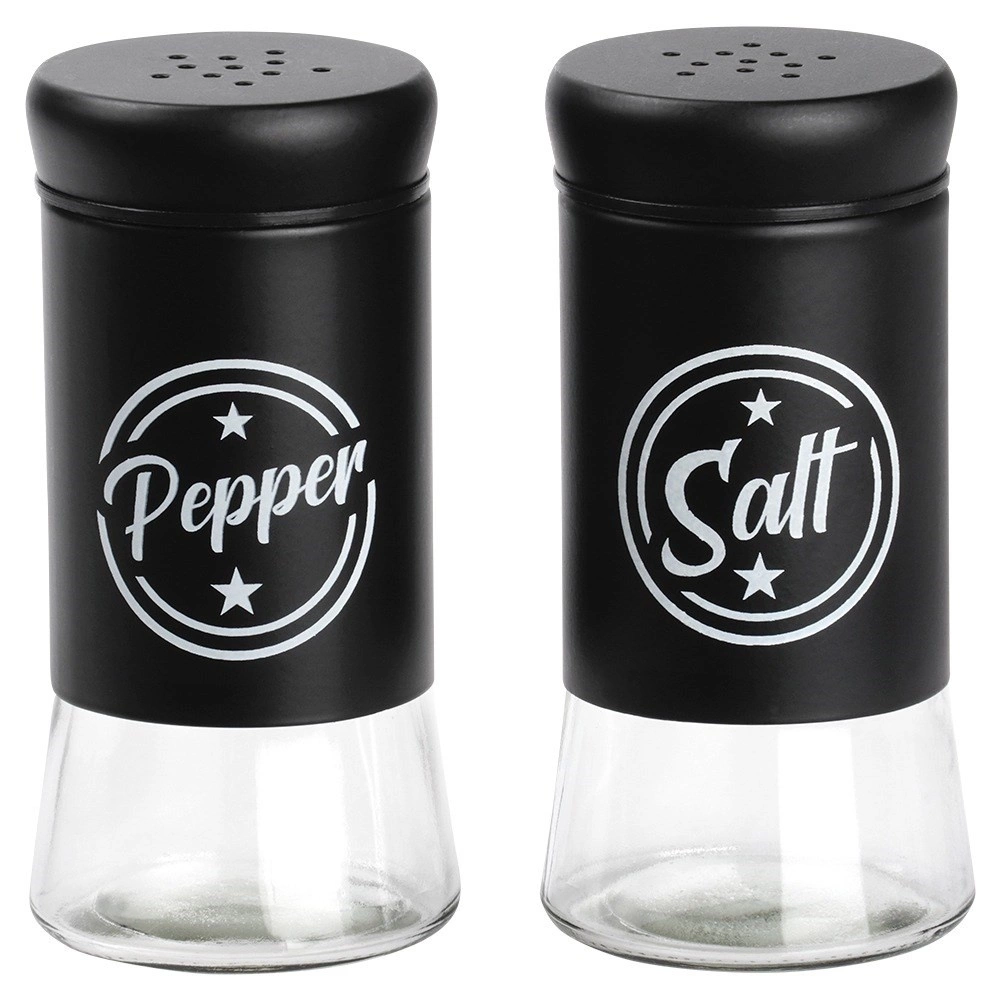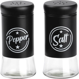 Zestaw zawiera dwa przyprawniki o pojemności 140 ml z przezroczystym szklanym dnem i matowo czarną metalową górną częścią. Praktyczne wieczka z otworami umożliwiają równomierne sypanie i pomagają zachować świeżość i aromat przypraw na dłużej. Dzięki wyraźnym napisom Salt i Pepper zawsze szybko rozpoznasz właściwy pojemnik.