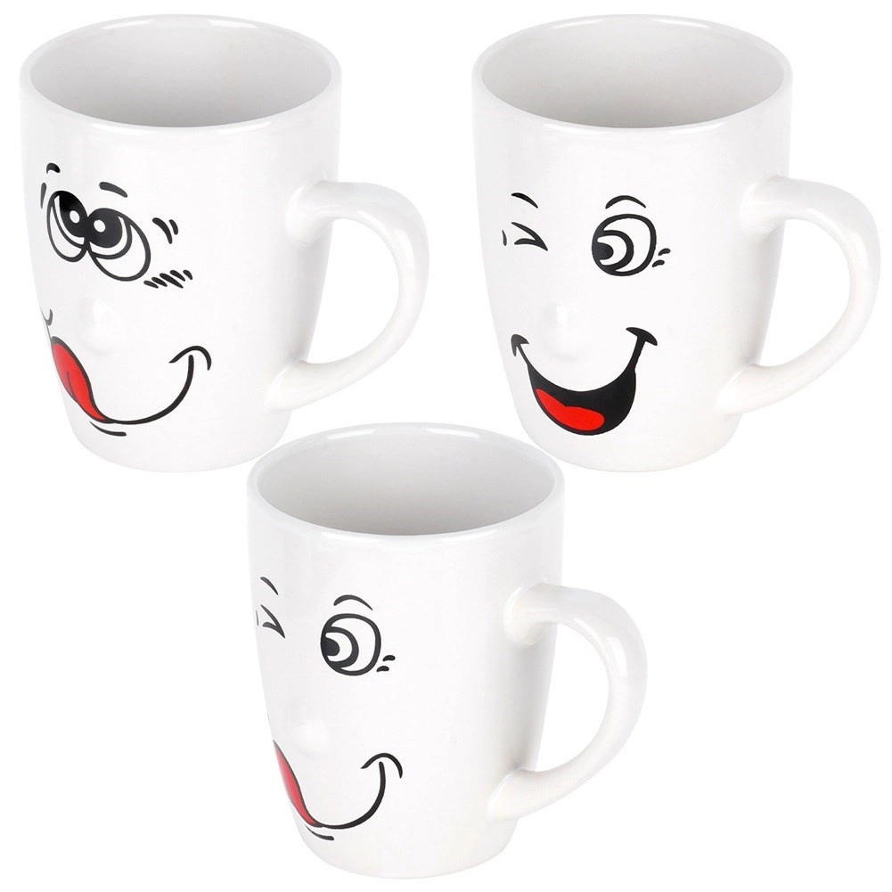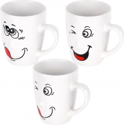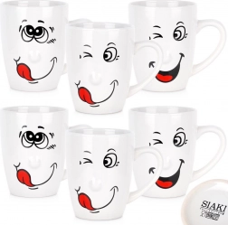 Wnieś na stół odrobinę zabawy. Ten zestaw 6 kubków z wysokiej jakości białej ceramiki zachwyca wesołymi motywami twarzy, które dodają każdemu łykowi kawy czy herbaty szczypty dobrego humoru. Kubki mają wygodne ucho w kształcie C, dobrze leżą w dłoni, a dzięki gładkiej, szkliwionej powierzchni łatwo je wyczyścić.