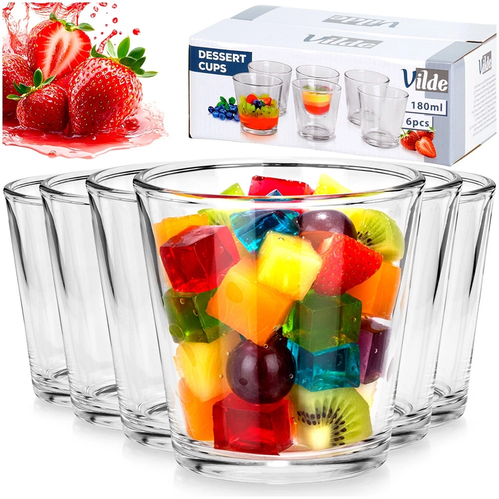 Eleganckie szklane pucharki o pojemności 180 ml w zestawie 6 sztuk są idealne do serwowania deserów oraz słonych przekąsek. Dzięki przezroczystemu szkłu pięknie eksponują warstwy i kolory. Pucharki są stabilne, mają grube dno i można je myć w zmywarce – doskonały wybór na przyjęcia, bankiety i do codziennego użytku.