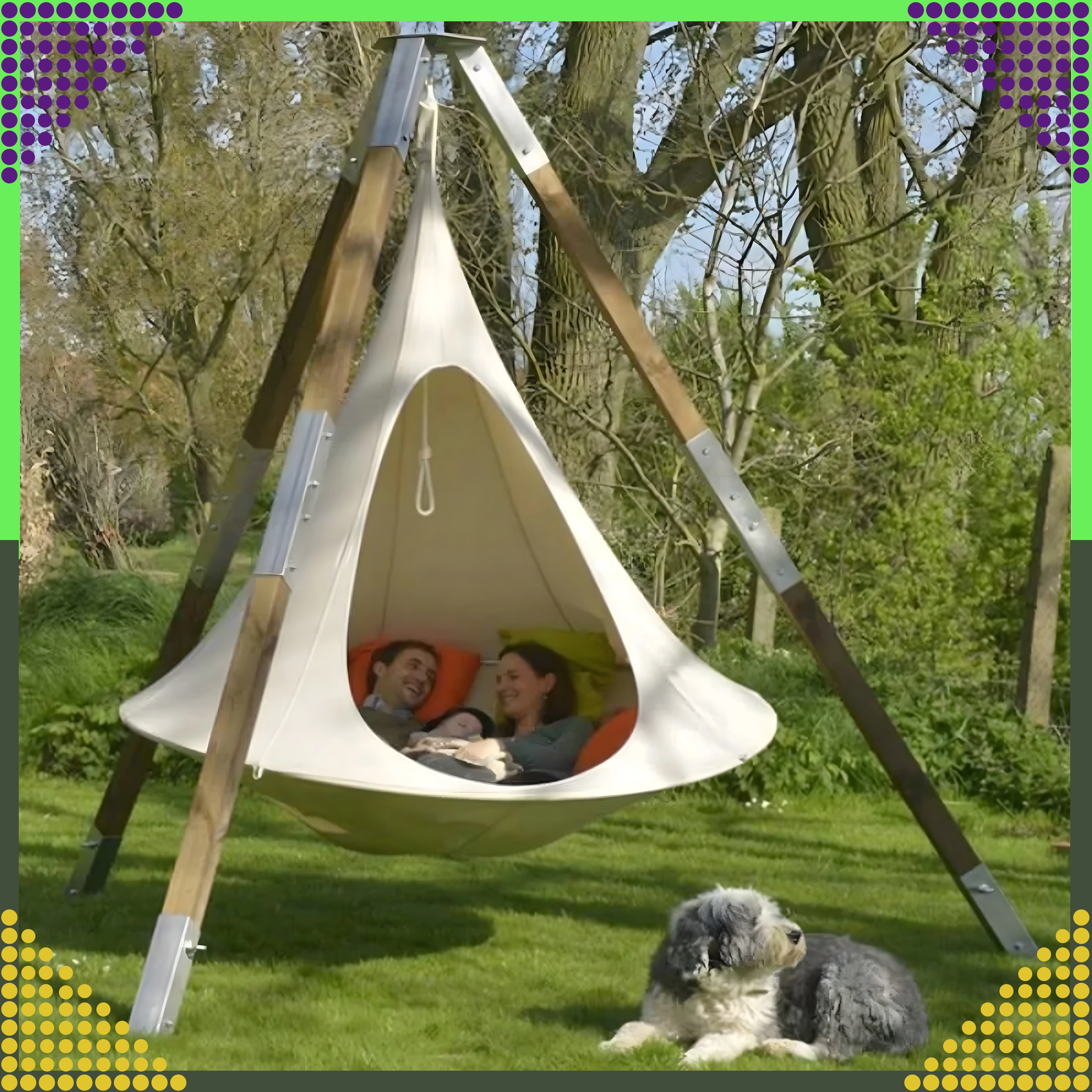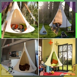 Wiszący hamak w kształcie kokonu tworzy przyjemną, bezpieczną i spokojną przestrzeń do czytania, relaksu lub popołudniowej drzemki. Dzięki oddychającemu materiałowi i trwałemu zawieszeniu na jednym punkcie nadaje się do pokoju dziecięcego, salonu oraz do ogrodu pod drzewem. Beżowy kolor łatwo dopasować do każdego stylu.