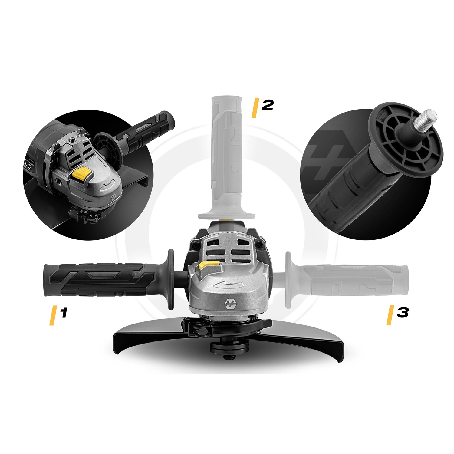 Ergonomiczna, antypoślizgowa i obrotowa rękojeść 180° wraz z bocznym uchwytem z 3 pozycjami (lewo/prawo/góra) zapewnia wygodną obsługę dla prawo- i leworęcznych. Metalowa osłona tarczy z szybką regulacją kąta bez użycia narzędzi zwiększa bezpieczeństwo i oszczędza czas. Długi, wytrzymały przewód zasilający 209 cm daje swobodę ruchu również na większych stanowiskach pracy.