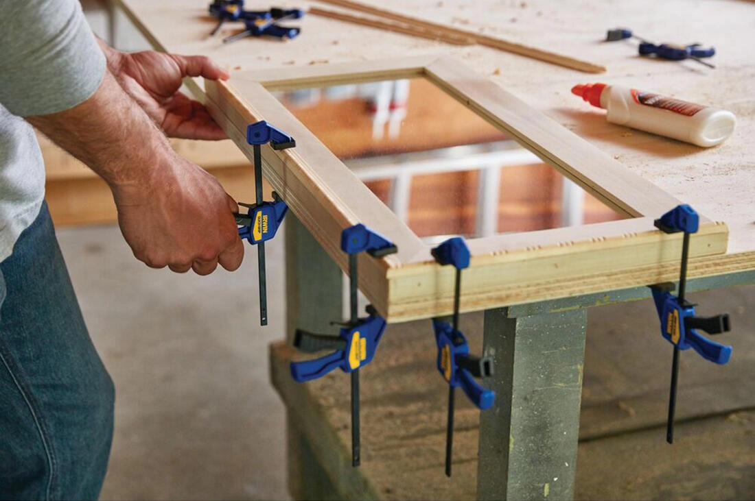 Gumowane szczęki z pełnopowierzchniowymi podkładkami równomiernie rozkładają nacisk i chronią drewno, laminat oraz wrażliwe materiały przed odciskami i zarysowaniami.
