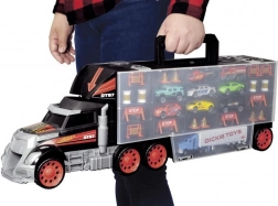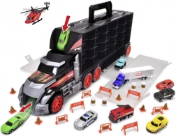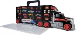 Ogromna ciężarówka–walizka łączy funkcję pudełka do przechowywania i zestawu do zabawy w jednym. Otwierane przegródki mieszczą cały zestaw pojazdów i akcesoriów, a praktyczny uchwyt ułatwia przenoszenie. Ręczny mechanizm startowy w kabinie zmienia ciężarówkę w tor wyścigowy i zapewnia dynamiczne starty.