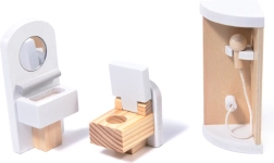 W zestawie znajdziesz 16 elementów mebli: stół, krzesła, łóżko, lampę, fotel, sofę, stolik kawowy, telewizor, pianino, ławkę, leżak, parasol, prysznic, umywalkę i toaletę.