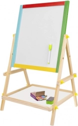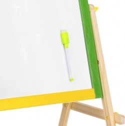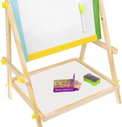 Dwustronna drewniana tablica dla dzieci z czarną i białą (suchościeralną) stroną wspiera kreatywność, naukę i motorykę małą. Kolorowa rama z gładko wykończonego drewna, stabilną konstrukcję uzupełnia praktyczna półka na akcesoria. W zestawie znajdziesz marker, gąbkę i kredy – gotowe do natychmiastowego użycia.