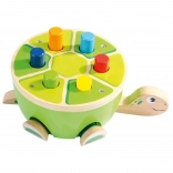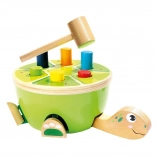Ta żółwia ławeczka do wbijania od Bino to idealny wybór na pierwsze gry motoryczne. Dzieci przy pomocy drewnianego młotka z miękkim filcowym pokryciem bezpiecznie wbijają kolorowe kołeczki w pancerz. Podczas zabawy naturalnie rozwijają się mała motoryka, koordynacja ręka–oko oraz koncentracja, a dzięki wesołemu wyglądowi zabawka utrzymuje uwagę na długi czas.