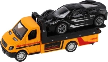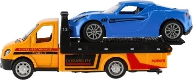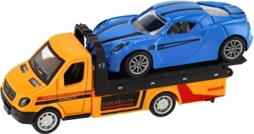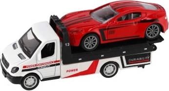 Realistycznie wykonany holownik z załadowanym sportowym autkiem wzbogaci dziecięcą flotę o lubiane auto użytkowe. Dzięki napędowi pull-back wystarczy docisnąć, puścić i patrzeć na akcję – idealne do scenek z miasta, drogi i warsztatu.