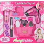 W zestawie znajduje się działająca suszarka na baterie (zasilanie 1× AA, brak w zestawie), bezpieczne narzędzia dla dzieci oraz praktyczny organizer/kieszonka do przechowywania wszystkich fryzjerskich przyborów.