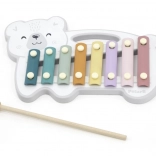 Drewniany ksylofon w kształcie niedźwiedzia polarnego łączy zabawną estetykę z funkcjonalnym instrumentem muzycznym. Pastelowo kolorowe metalowe listwy tworzą przyjemne tony po uderzeniu drewnianą pałeczką, naturalnie zachęcając dzieci do eksperymentowania z dźwiękami i rytmem.