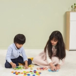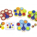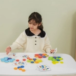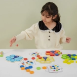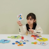 Dzieci dopasowują krążki według kart lub wyniku rzutu kostką, naturalnie przyswajając kolory oraz trenując uwagę i logiczne myślenie.