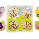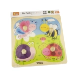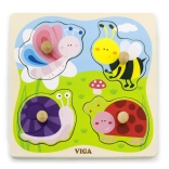 Drewniana układanka VIGA z 4 dużymi elementami z uchwytami to idealne pierwsze puzzle dla najmłodszych. Kolorowe motywy owadów i zwierzątek z łąki naturalnie motywują dzieci do odkrywania i nauki. Frezowane krawędzie na solidnej drewnianej podstawie pomagają, by każdy element pewnie trzymał się na swoim miejscu.
