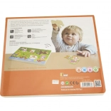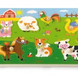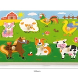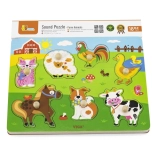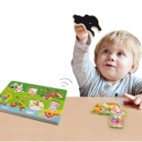 Drewniana układanka ze zwierzątkami, dźwiękowa. Po umieszczeniu właściwego zwierzątka rozlega się dźwięk, który to zwierzątko wydaje. Wymiary planszy ok. 30 × 22,5 × 2 cm. Zasilanie: 2 × bateria AAA (brak w zestawie). Wymiary opakowania ok. 30 × 27 × 2 cm. Wiek: 18m+.