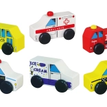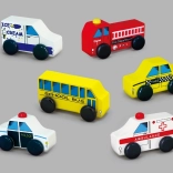 Zestaw drewnianych autek to idealne uzupełnienie dziecięcego pokoju. Zawiera autobus szkolny, samochód policyjny, samochód z lodami, taksówkę, wóz strażacki oraz ambulans. Każde autko oferuje specyficzne elementy, które wspierają naukę i rozwój zdolności motorycznych.