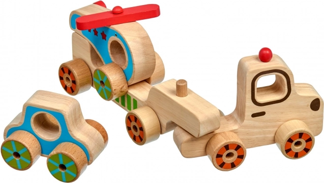 Ta drewniana układanka dla najmłodszych łączy zabawę z nauką. Dzieci mogą samodzielnie jeździć ciężarówką, autkiem i helikopterem, a następnie załadować wszystko na pakę i wyruszyć „w drogę”. Kolorowe akcenty i proste kształty wspierają rozwój percepcji wzrokowej, a manipulacja elementami ćwiczy chwyt i zręczność.