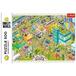 Puzzle Trefl Gdzie jest Smiley? oferują wyzwanie układania w postaci kolorowego miejskiego panoramatu.