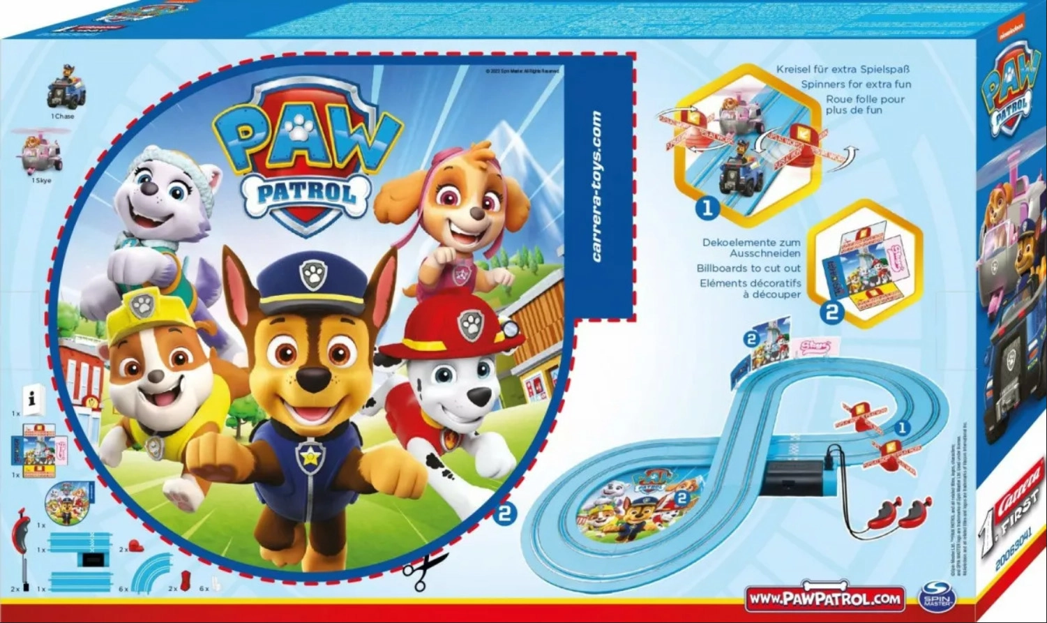 Odkryj pierwszą wyścigową trasę dla dzieci od 3 lat – CARRERA First z licencją Psi Patrol. Zestaw oferuje wszystko do natychmiastowej zabawy: dwa szczegółowo zdobione autka Chase i Skye, proste odcinki, zakręty oraz efektowne kręcące się śmigła, które zwiększają frajdę podczas przejazdu. Dzięki zasilaniu bateryjnemu tor jest mobilny i łatwo go rozstawić gdziekolwiek.