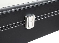 Szklana pokrywa umożliwia szybki podgląd i stylową prezentację kolekcji. Czarna eko skóra z białym przeszyciem nadaje premium wygląd.