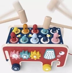 Ta zabawka wspiera rozwój małej motoryki i koncentracji dzięki interaktywnym elementom, takim jak młoteczki i koła zębate.