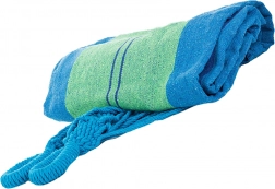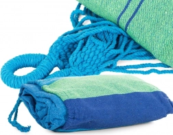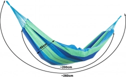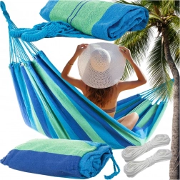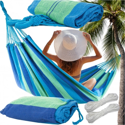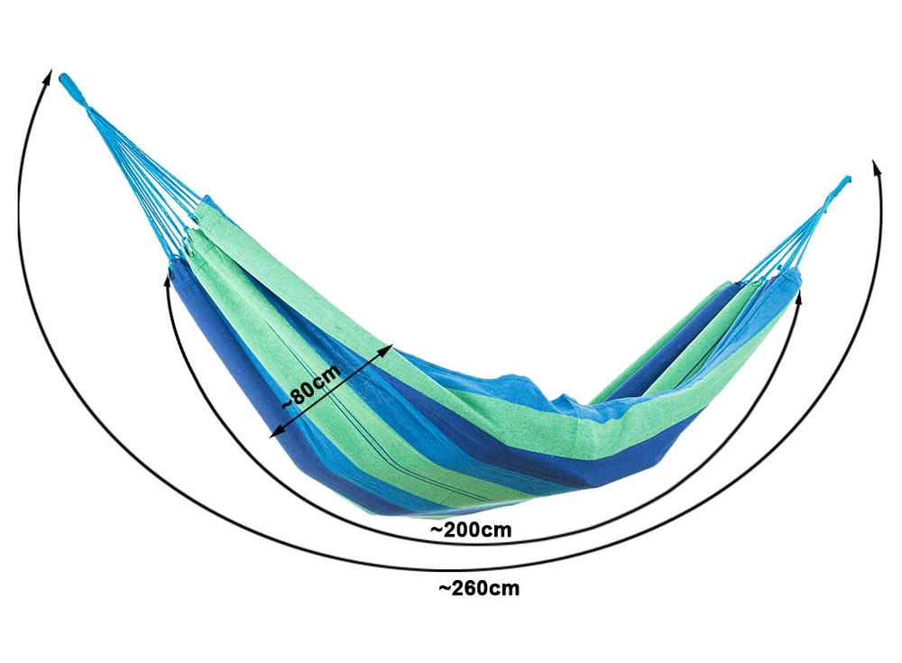 Ta wytrzymała tekstylna siatka hamakowa w niebiesko–zielone pasy to świetny wybór do ogrodu, na taras, balkon i na kemping. Szeroka powierzchnia leżenia zapewnia komfortowy relaks, oddychająca tkanina jest przyjemna w dotyku, a wzmocnione zakończenia z wielolinowym zawieszeniem rozkładają ciężar dla większej stabilności.